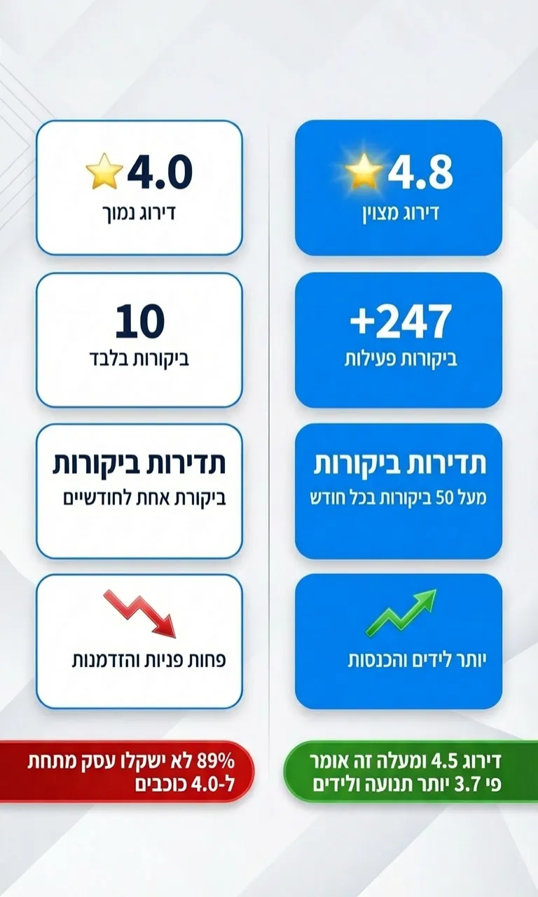 דירוג של 4.5 כוכבים ומעלה מייצר עד 32% יותר הכנסות לעומת מתחרים בעלי דירוג נמוך יותר (Womply).